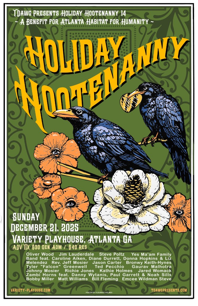 The concert historically has three sets, totals almost four hours of music and at times features up to 15-20 musicians on stage at once. This year features a musical energy that is truly unique, featuring The Wood Brothers’ Oliver Wood, who performed locally in 90s with his band King Johnson, the legendary troubadour Steve Poltz, and multi-Grammy winners Jim Lauderdale and Jason Carter (formerly with Del McCoury Band, The Traveling McCourys) as well as Atlanta folk rock icons Caroline Aiken, Diane Durrett, Donna Hopkins & Liz Melendez, and Rev. Jeff Mosier, who has performed at every Holiday Hootenanny. Come see for yourself why this concert is so unique and special, truly a great ATL event!