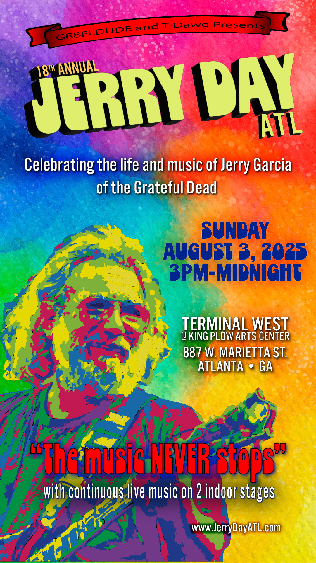 Celebrating the life and music of Jerry Garcia of the Grateful Dead – “the music NEVER stops” with bands performing on 2 indoor stages, featuring some of Georgia’s finest bands and players.