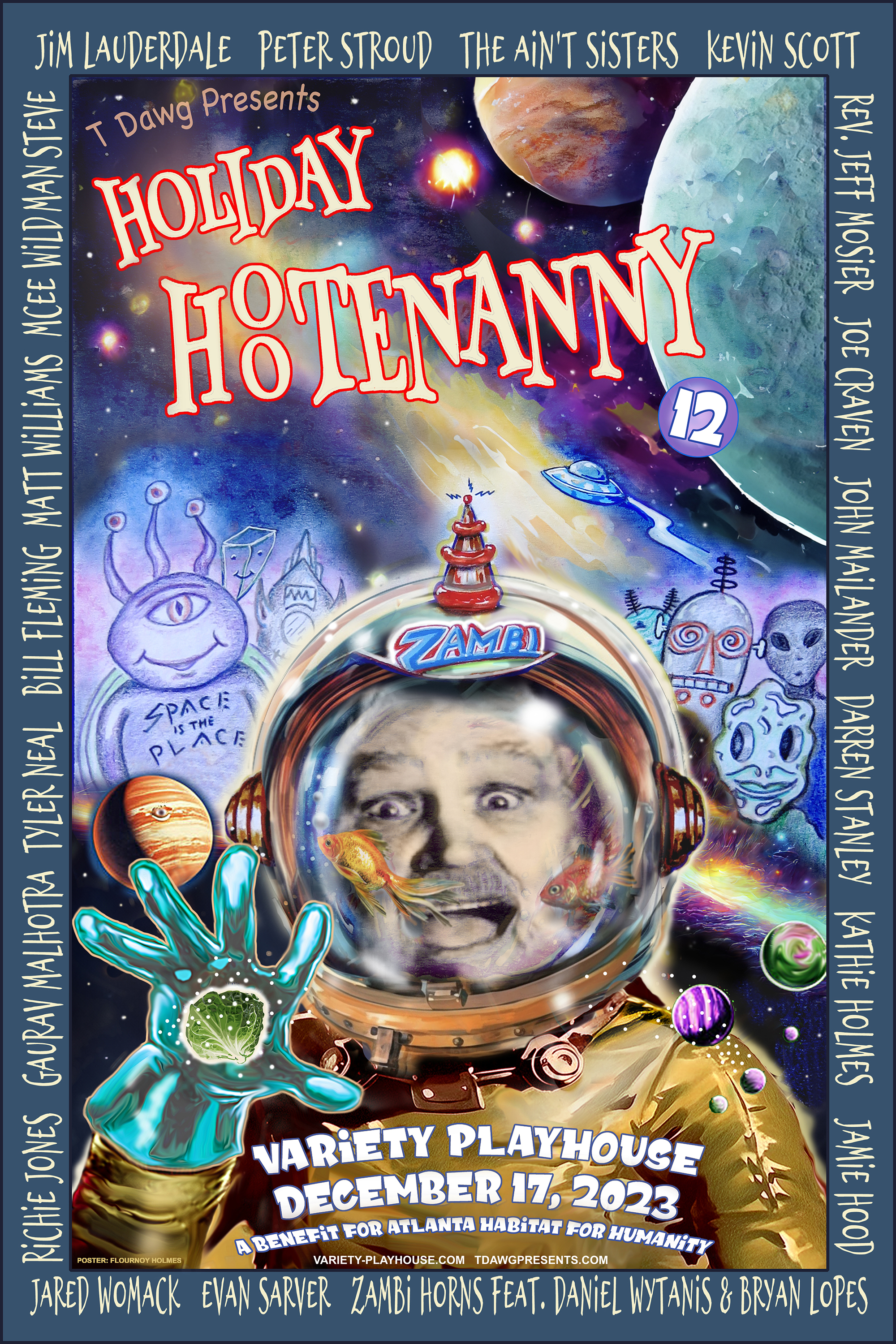 We’re just 9 days out from what promises to be an absolutely smokin’ Holiday Hootenanny 13 raising funds and awareness for Atlanta Habitat for Humanity! I’ve spent the week putting the show together, and let’s just say we’re gonna be very JAM HAPPY! 👽🎶  The musicians are pumped, and there promise to be quite a few collaborations you might not see again. Below are ticket ino and the schedule, expect Brandon “Taz” Niederauer to be all over the map. Please continue to spread the word, please feel free to share this note or the attached poster.
